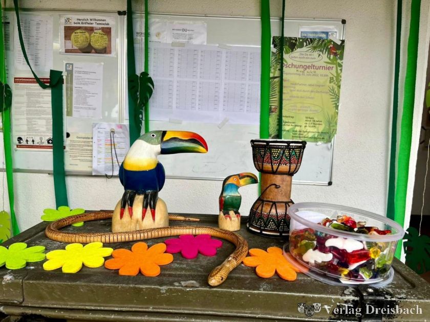 Die erste Mannschaft der Damen 40 hatte die tolle Idee nach vielen Jahren mal wieder ein Dschungelturnier am Pfingstsonntag zu organisieren. Ursprünglich hatte Hugo Bauwens diese Turnieridee vor sehr langer Zeit aus Kenia mitgebracht. Als ältester Teilnehmer und Mitglied mit der längsten Mitgliedschaft ließ er es sich nicht nehmen auch diesmal wieder dabei zu sein. Die Mannschaft um Bettina Braun hatte richtige Dschungelgeräusche, passende Deko, Schatzkiste und viele weitere liebevolle Details gut vorbereitet. Sogar das Wetter hatte sich mit Temperatur und Luftfeuchtigkeit dem Dschungel angepasst.