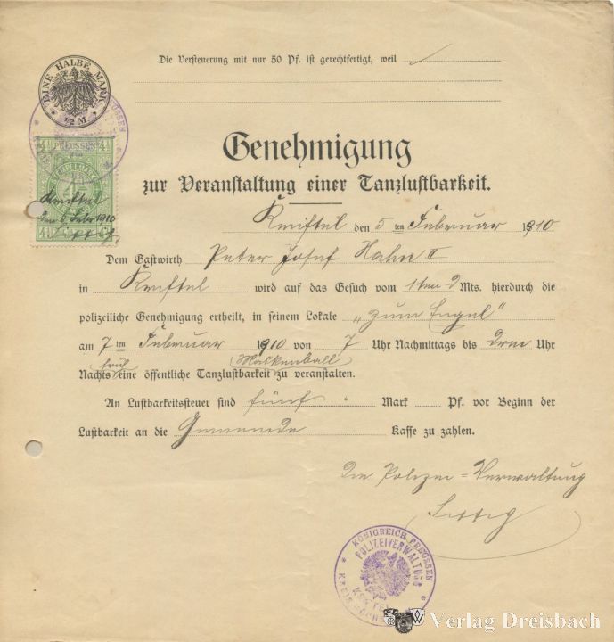 Generell mussten Gastwirte vorab beim Bürgermeister als Vertreter der Polizeiverwaltung eine Genehmigung einholen, wenn „Tanzlustbarkeiten“ oder Konzerte in ihren Räumen stattfinden sollten. Dies zeigen Dokumente, die erst kürzlich dem Heimatmuseum übergeben wurden. Peter Josef Hahn, Inhaber des Lokals „Zum Engel“, erhielt beispielsweise die Erlaubnis, am 7. Februar 1910 eine „Tanzlustbarkeit“ als Maskenball zu veranstalten. Dafür musste er eine Lustbarkeitssteuer von 5 Mark war an die Gemeinde zahlen; dies entspricht nach heutiger Kaufkraft etwa 35 Euro, wie Museumsleiter Dr. Detlef Krause berichtet. Die Events gingen teilweise bis drei oder vier Uhr morgens. Der Nachtwächter kontrollierte penibel, ob die genehmigten Zeiten auch eingehalten wurden.