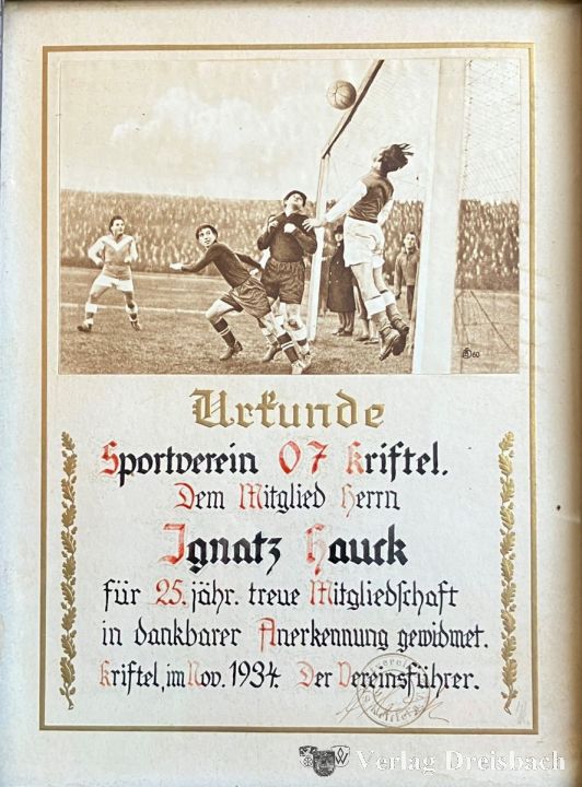 Von anderer Seite erhielt das Museum eine Urkunde für Ignatz Hauck für seine 25-jährige Mitgliedschaft beim SV 07 Kriftel im Jahr 1934. Weitere interessante Zugänge sind Sparbücher der Genossenschaftsbank und der Nassauischen Sparkasse in Kriftel.