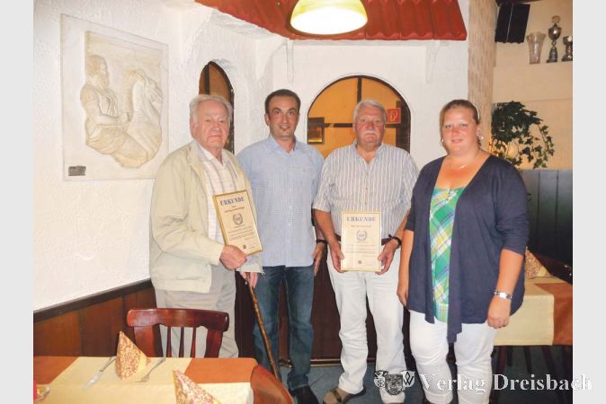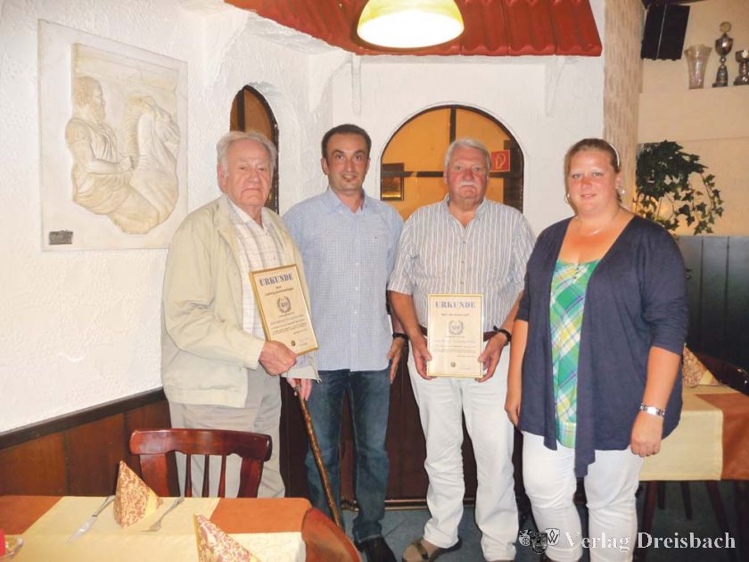 Nach dem Essen nahmen die Jubilare an der Jahreshauptversammlung teil, wo sie dann noch mit einer Urkunde sowie einem Präsent geehrt wurden. Auf dem Bild v. l. nach rechts Jubilar Ludwig Lautenschläger, 1. Vorsitzender Selvin Golos, Jubilar Hermann Luft sowie 1. Kassiererin Sandra Gretzschel.