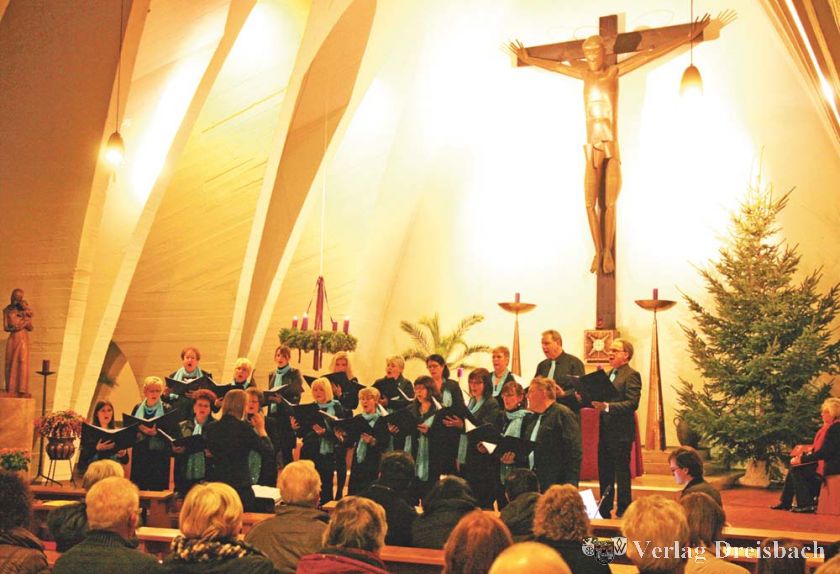 Pfarrer Karl Zirmer und Germania-Vorsitzender Peter Zankel durften die Zuhörer bei ihrer Begrüßung auf ein umfangreiches Repertoire einstimmen. Denn sowohl die „Happy Voices“ als auch der Gemischte Chor, der heutige Stammchor des vor 146 Jahren als Männerchor gegründeten Gesangsvereins, traten für je zwei Blöcke auf die Stufen zum Altarraum. Zum Abschluss sangen beide Chöre gemeinsam den „Weihnachtsstern“ und mit dem Publikum zusammen „O du Fröhliche“.
