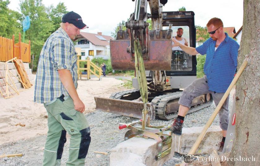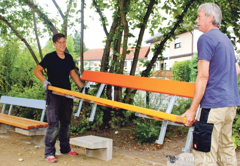 Gegenwärtig sind bis zu sechs Mitarbeiter des Bauhofs auf dem Spielplatz tätig. Nachdem die bis zu 250 Kilo schweren Steine der Hügelanlage schon vor einiger Zeit von Bauhofmitarbeitern gesetzt wurden, sind jetzt die Umrandungssteine für die Bäume an der Reihe. Gleichzeitig installieren Mitarbeiter die selbstgebauten Sitzbänke auf neue Betonfundamente. Das Holz stammt aus dem Bischofsheimer Wald. Die Bänke passen perfekt zu den hölzernen Fahrradständern und dem neuen Eingangstor – alles ebenfalls Einzelanfertigungen des Bauhofs.