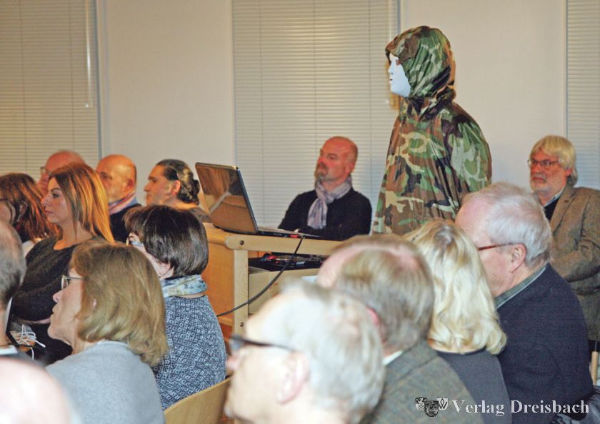 Bringmann stand während der Videovorführung in Tarnuniform und weißer Maske regungslos am Laptop. Diese Tarnung bot die Möglichkeit, eine Art Blankobild des gewöhnlichen Täters jener Zeit zu entwerfen. Der hat kein Gesicht, weil es letztlich die Kontur sehr vieler, zu vieler Menschen abbilden müsste.