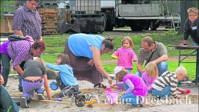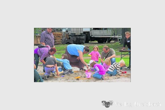 Am Sonntagmorgen herrschte auf der Anlage, bei leicht bewölktem Himmel, dann reger Betrieb. Die Kinder konnten sich bei einer „Diamantensuche“ im Sandkasten Freifahrtscheine verdienen. Eifrig durchsiebten die jungen Fahrgäste den Sand nach den begehrten Glasperlen, die sie danach in das Fahrvergnügen umsetzten, dementsprechend herrschte auf dem Bahnsteig schon bald reger „Reiseverkehr“.