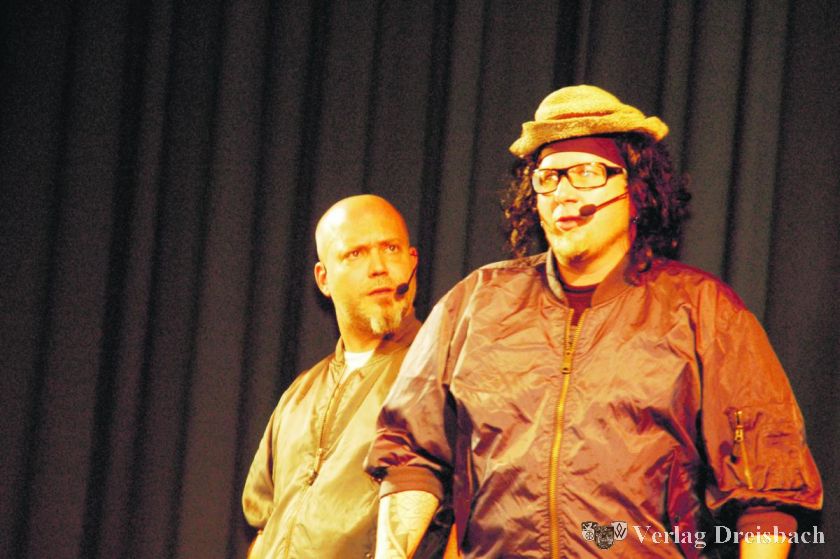 „Was ein geiler Empfang“ stachelten sich Ande Werner und Lars Niedereichholz dann gegenseitig an und redeten sich in Rage. Kaum fünf Minuten auf der Bühne, hatten sie sich und das Publikum auch schon warm geredet. „Mundstuhl“, eigentlich eine eher unappetitliche Sache, gingen auch verbal an die Grenzen des Humors und des guten Geschmacks. Was die beiden da vom Stapel ließen, war zumeist rhetorisch lustvoll eingefädeltes Nonsensgeplapper, aber auch zeitweise ein Zerrspiegel über ausgewählte Randgruppen.