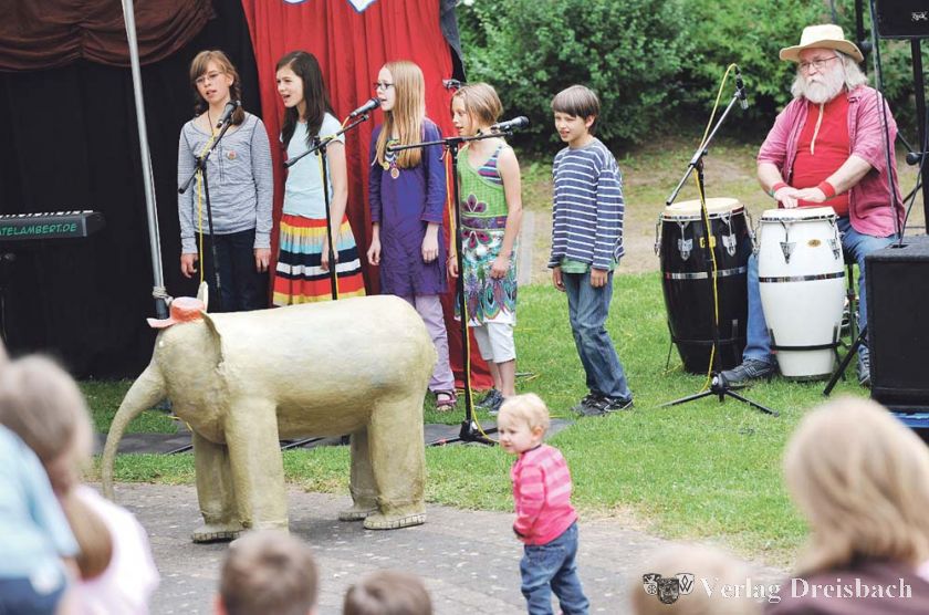 Es soll auch das eine oder andere feuchte Auge gegeben haben, war zu erfahren. Zum Beispiel hatte Vahle mit Ulrich Freise Ende der Sechzigerjahre eine Langspielplatte mit Gedichten von Heinrich Heine zu Revolutionsliedern vertont. „Die beiden haben sich Jahrzehnte nicht mehr gesehen“, verriet Buchhändler Horst J. Jansen den rund 200 Kindern, Müttern und Vätern, die sich inzwischen im Atrium im Schatten der Villa Herrmann versammelt hatten.