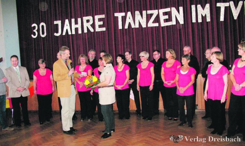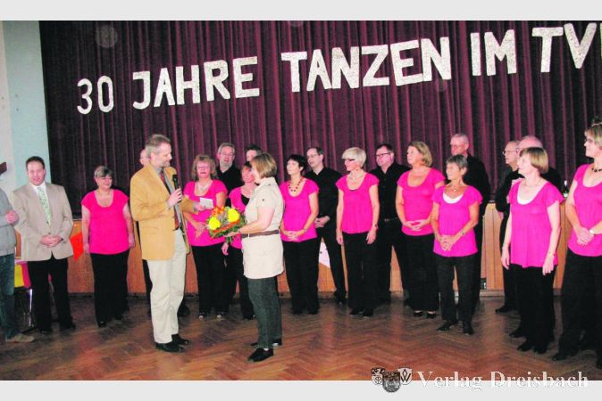 Die Cha-Cha-Cha-Formation aus allen vier Breitensportgruppen mit zehn Paaren, choreographiert und einstudiert von Michael Maag, erntete viel Applaus und kam um eine Zugabe nicht herum. Umrahmt von den Tänzerinnen und Tänzern der Cha-Cha-Cha-Formation bedankte sich der 1. Vorsitzenden des TVG, Bernd Westerdorff, mit einem Blumenstrauß und einem Geschenkgutschein bei Ellen Frei für ihre über 20-jährige Arbeit in der Tanzabteilung.
