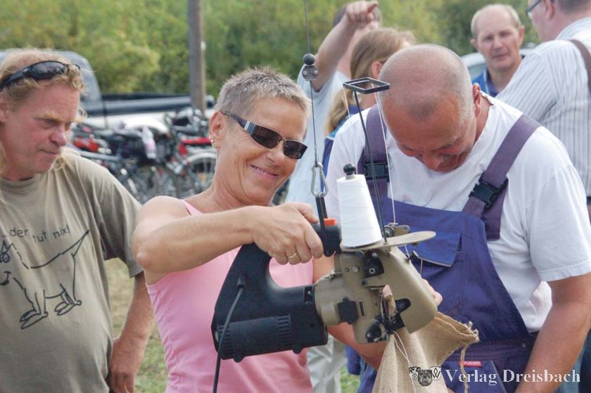 Keine Hilfskräfte für das Sandmännchen sondern Ginsheimer Deichschützer sind hier am Werk und verschließen mit einem Nähgerät, das bald darauf den Geist aufgeben sollte, den frisch befüllten Sandsack.?(Foto: Gössl)