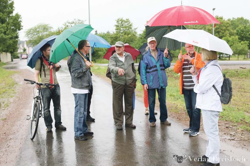 Das Dutzend, das Gutmann noch in die Felder führte, reduzierte sich im Laufe der nächsten Kilometer noch einmal um die Hälfte. Doch das Wetter wurde besser, es tröpfelte nur noch ein wenig, als Guthmann unerschrocken und immer noch unbeschirmt durch die Gemarkung führte. Die Mitwanderer erfuhren einiges über die Auswirkung der sehr unterschiedlichen Bodenbeschaffenheit im Ginsheimer Bereich, vom lockeren Sand im Schwemmland bis zu Kiesschichten im „Zwerchgewann“, in Richtung Bischofsheim gelegen.