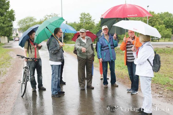 Wie aber in gesitteter Tracht, also nicht als tropfender Pudel endend, von hier nach da kommen? Regenschirme hatte bis auf Guthmann jeder dabei, aber sich über die Felder zum Ziel zu retten, konnte nicht Sinn des Tagwerks sein. In einer allzu kurzen Regenpause machte sich der Tross los und war heilfroh, mit dem Bürgerhausvordach gleich die nächste Unterstellmöglichkeit vorzufinden, goss es doch inzwischen wieder kräftig.