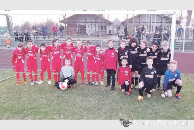 Beigefügtes Foto zeigt die beiden Mannschaften von der SV 07 Bischofsheim (rote Trikots) und des 1. FSV Mainz 05. (Foto:privat)